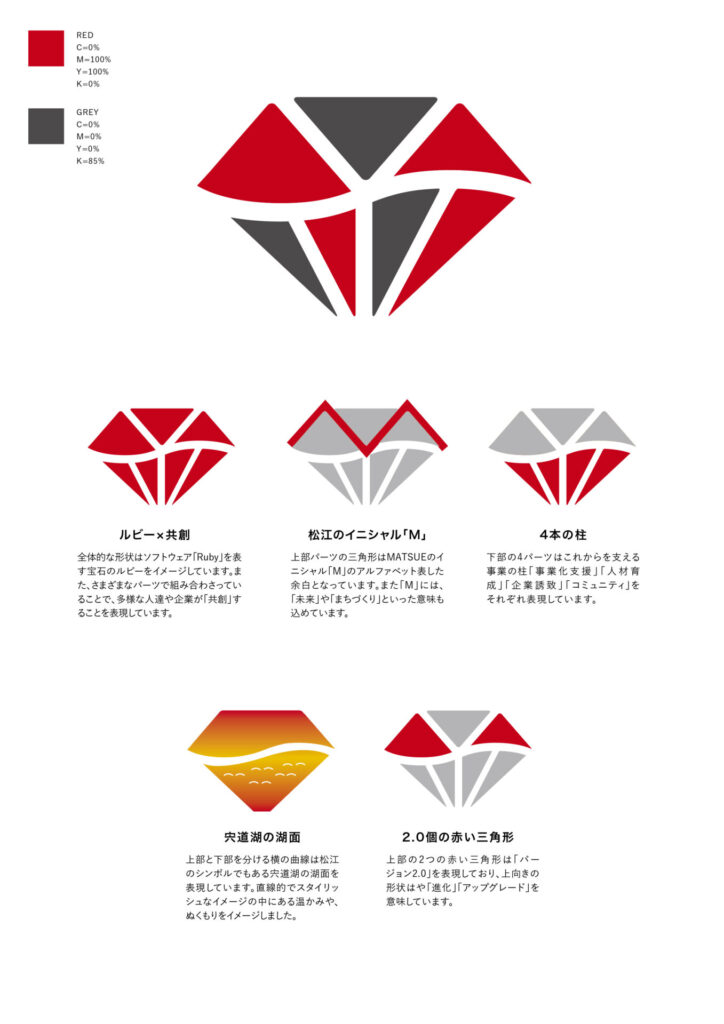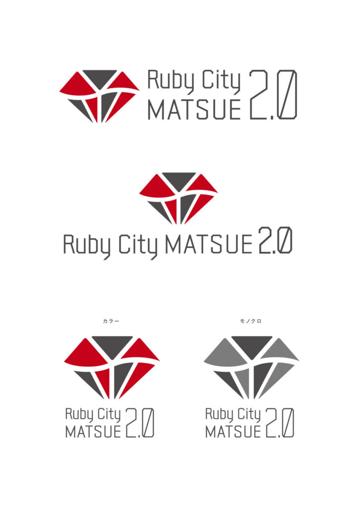 松江市がIT・オープンソースソフトウェア、特にRubyを中心とした産業興策「Ruby City MATSUE2.0」プロジェクトロゴをデザインさせていただきました。配色は2.0にちなんで、赤と黒のツートーンで作成しました。赤はルビーの宝石の色や松江の宍道湖の夕日、未来へ向かう情熱的なエネルギーを表現し、もう一方の黒は、国宝・松江城など松江のこれまでの歴史文化や重みを感じさせるカラーになっています。